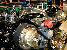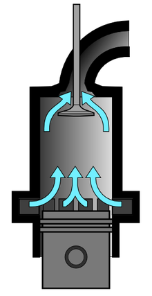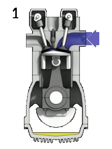 내연 기관의 하나인 4행정 가솔린 기관의 구조: C – 크랭크축. E – 배기 캠샤프트. I – 흡기 캠샤프트. P – 피스톤. R – 커넥팅 로드. S – 점화 플러그. V – 밸브. 빨강: 배기, 파랑: 흡기. W – 액체 냉각 통로. 회색 몸체 – 엔진 블록.